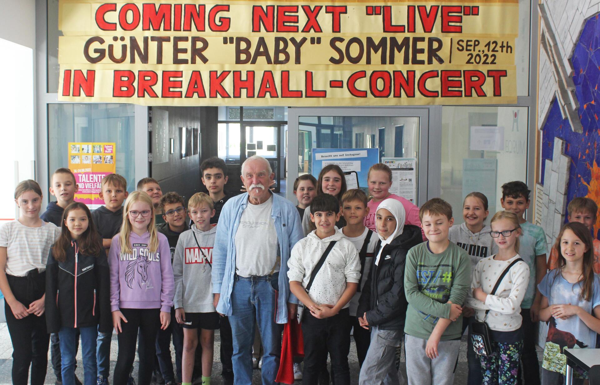 Am 12.09.2022 kam Günter Baby Sommer, besser bekannt als Baby Sommer, an unsere Schule und bot einen Free Jazz Workshop an, wo viele Klassen und Lehrer anwesend waren. Dort konnte man Günter Sommer und seine Musik hautnah miterleben und Einblick erhalten in spannende Zusammenhänge seiner bald 80jährigen Biografie. Es war ein Highlight für alle, die dabei sein durften, denn sowas hat man davor nie erlebt. Günter Baby Sommer ist die Free Jazz Legende, einer der ersten seiner Generation, die es geschafft haben aus der DDR heraus international große Anerkennung zu gewinnen.