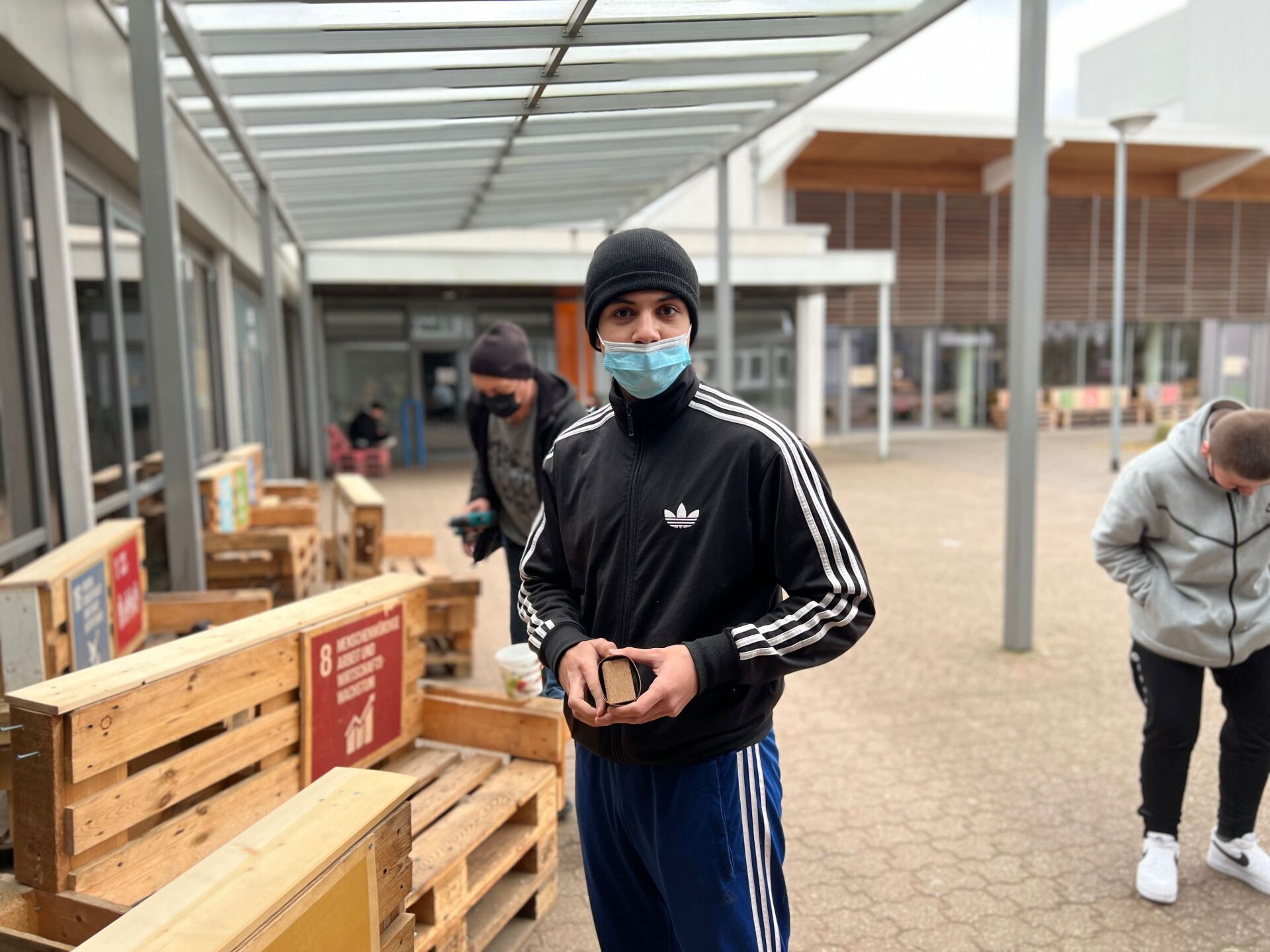 Fernando: Auf dem Schulhof von dem C-Gebäude und wieder auf dem Schulhof auf dem G-Gebäude.