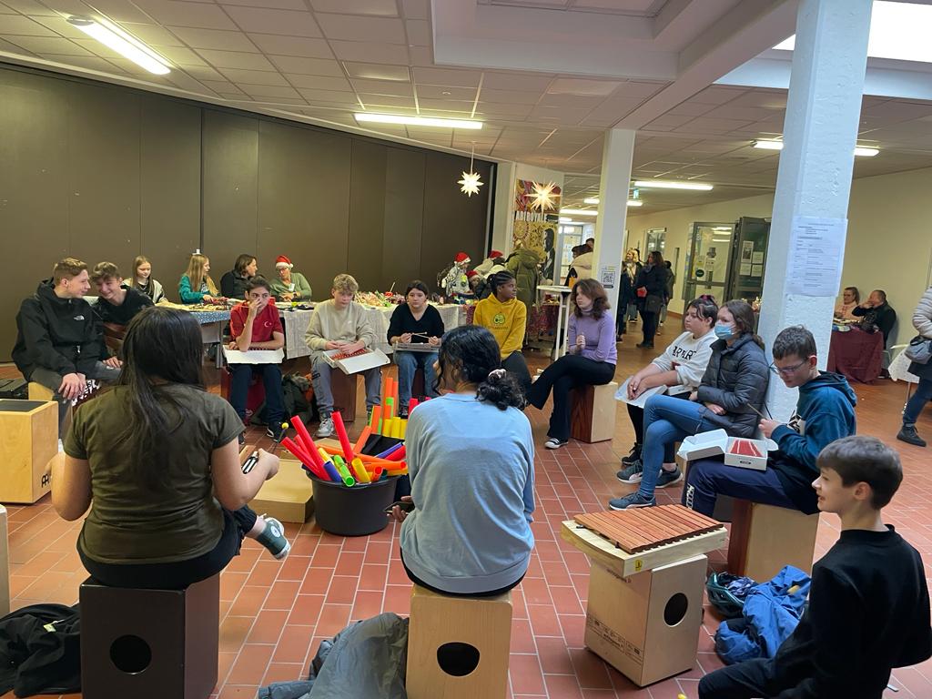 Zu Weihnachtsstimmung gehört neben Besinnlichkeit auch ein wenig Nachdenklichkeit, und so passte es ganz vortrefflich, dass man auch Stände fand, die Hilfsprojekte z.B. unserer Partnerschulen vorstellten. So verkaufte das Lehrerteam um Hr. Bischof, Fr. Herrschaft und Fr. Terstegen künstlerische Bilder und mit dem Geld, das sie einnahmen, unterstützen sie eine Schule in Ghana.